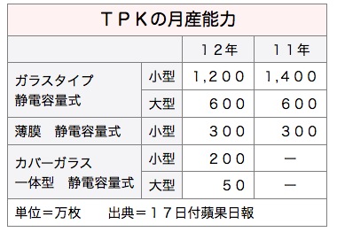 同社最大の顧客、アップルがスマートフォン次世代機種「iPhone 5」にタッチセンサー内蔵のインセル型タッチパネルを採用し、TPKは受注できないとの市場観測が出る中、同日の株主総会では株主から「アップルに騙されているのでは」との意見も出たが、江董事長は「市場には騙す、騙されるという関係はなく、タッチパネルはアップル専用でもない」と強調した。ただ、今年は大型タッチパネル受注は増えるが、小型の受注は少し失う可能性があると語った。