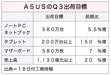 証券会社は、ASUSはノートPCのほか、受託生産しているグーグルの低価格タブレット型PC「ネクサス7」も販売好調なため、第3四半期の連結売上高は前期比2割以上増の1,130億台湾元(約3,000億円)となり、四半期ベースの過去最高を更新すると予測している。