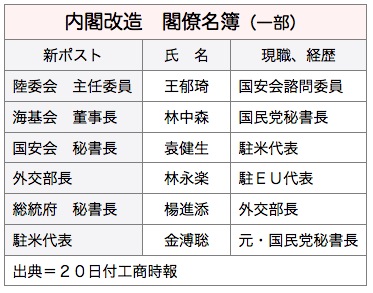 総統選後の今年2月の内閣改造時には、外交、国防分野の閣僚に異動はなかったが、馬総統は内閣改造論の高まりにも配慮しながら 一連の人事を決定したもようだ。