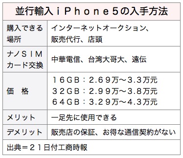 iPhone5並行輸入品については既にインターネットサイトなどで販売の告知がなされており、価格は▽16GB(ギガバイト)機種、2万6,900〜3万3,000台湾元(約7万2,000〜8万8,000円)▽32GB機種、2万9,900〜3万8,000元▽64GB機種、3万2,900〜4万3,000元──となっている。販売業者は9月末までに数千台が売れるとみている。
