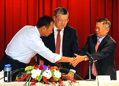 鴻海集団の郭台銘董事長(左)、台揚科技の王華燕董事長(中)、謝其嘉副董事長(右)。王董事長はiPhone人気が無線通信に無限の商機をもたらすと語った(21日=中央社)