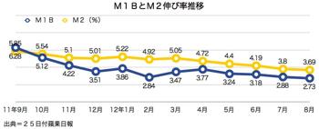 昨年10月以降、M1Bの伸びがM2の伸びを下回る「デッドクロス」の状況が続き、伸び率の差は7月の0.92ポイントから8月は0.96ポイントに拡大。株式市場への資金流入に陰りの色が一層濃くなった。