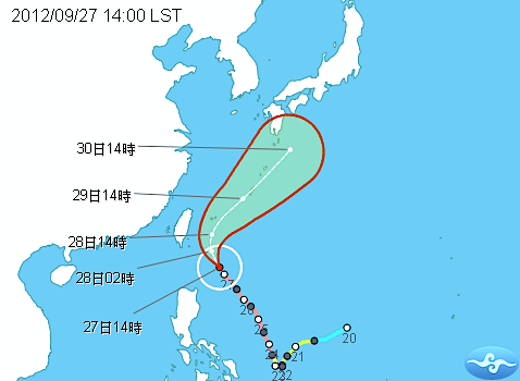 台風17号は既にバシー海峡に入り、午後2時半現在、鵝鑾鼻(屏東県恒春鎮)の東南東410キロメートルの海上を、北北西から北に向きを変えながら時速14キロで進んでいる。台風は今後台湾の東側の太平洋上を進み、28日夜に先島諸島に接近、29日日中には沖縄本島方向に進んで台湾から離れる見通しだ。