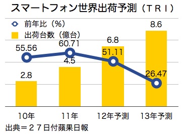 拓ボク産業研究所(ボクは土へんに僕のつくり、TRI)の予測によると、来年のスマートフォン世界出荷台数は前年比26.47%増の8億6,000万台、うち中国は同36.2%増の2億5,600万台の見通しだ。中国では今後、需要増と低価格化が進み、100米ドル以下の機種がますます普及すると見込まれ、これにより華宝通訊(コンパル・コミュニケーションズ)、華冠通訊(アリマ・コミュニケーションズ)などコストコントロールに強みを持つ台湾の携帯電話受託メーカーが恩恵を受けると分析した。27日付蘋果日報が報じた。