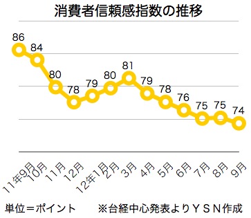 中央大学台湾経済発展研究中心(台経中心)が27日発表した9月の消費者信頼感指数(CCI)は前月比0.83ポイント下落の74.35ポイントで、過去2年5カ月で最低となった。28日付蘋果日報などが報じた。