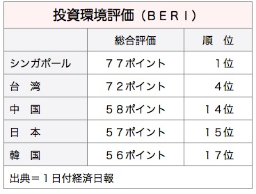 米国のビジネス環境リスク評価会社、BERI社が世界主要50カ国・地域を対象にまとめた最新の「投資環境評価報告」で、台湾の投資環境は4位となり、14位の中国、15位の日本、17位の韓国を上回った。1日付経済日報が報じた。