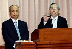 劉理事長(右)は立法院財政委員会に出席し、「愚かで市民に面倒をかける政策だ」と訴えた。左は張盛和財政部長(1日=中央社)