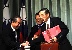 林永楽外交部長(右)は、成果を喜び外交部職員と握手を交わした(3日=中央社)