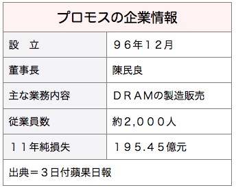 プロモスは、2011年の純損失が195億4,500万台湾元(約520億円)に上った。債務超過で今年3月末で店頭市場の上場廃止となり、取引銀行が4月末に提出した更生計画案がこのほど認められた。