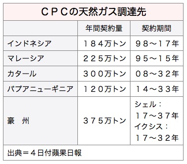 同社は必要とする天然ガスの7割を長期契約により、3割をスポット市場から調達している。現在、長期契約による調達は年間830万トンとなっている。そのうちマレーシアから調達している225万トンは15年の契約期限後も延長することが確定しているが、既に枯渇が確定しているインドネシアからの調達分は17年で契約が切れた後、パプアニューギニアからの調達に切り替える方針だ。