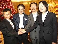 義聯集団による買収を発表した黄鎮台CPBL会長、謝秉育・義聯集団総合管理委員會執行長ら。チームは義聯集団の本拠地、高雄に移転することになる(13日=中央社)