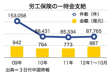 11月の最終集計は今月中にまとまるが、給付額は2009年に記録した最高額454億元を上回った可能性がある。給付申請の殺到は収まりつつあるが、現在も正常な状況には戻っていないという。