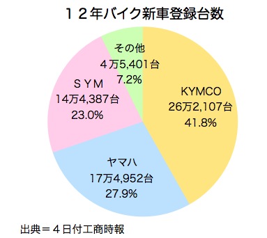 交通部数拠所の統計によると2012年通年のバイクの新車登録台数は62万6,847台で、前年比2.2%減となった。12月に前年同月比35%増の約4万600台を計上して9月以降の減少傾向に歯止めがかかり、最終的に予想を上回った。4日付工商時報が報じた。
