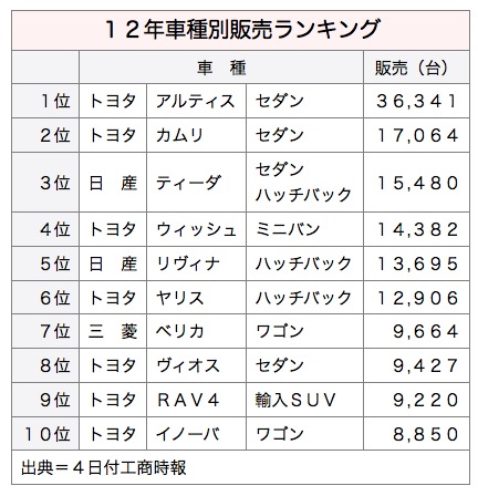 2012年の新車販売台数で、トヨタの台湾総代理店、和泰汽車が販売する「アルティス」が3万6,341台と、12年連続で車種別首位となった。1.8リッターモデルで70万台湾元(約210万円)足らずと価格競争力があり、2位の「カムリ」1万7,064台の2倍以上の売れ行きだった。4日付経済日報が報じた。