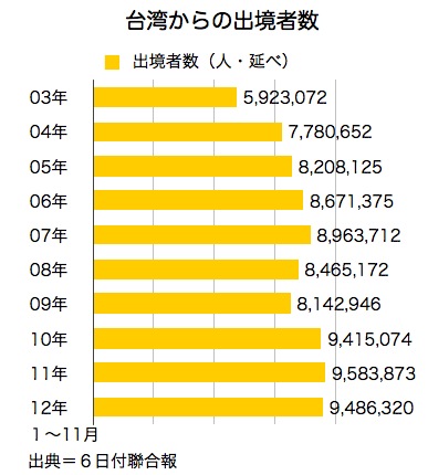 昨年1~11月の出境者数は延べ948万人で、過去最高だった2011年通年の958万4,000人に迫った。出境先の上位3カ国・地域は▽中国、延べ290万人以上▽香港、延べ約186万人▽日本、延べ144万人──だった。また、韓国への渡航者が、昨年4月の松山~金浦の航空路線開設を受けて前年比27%増となった。