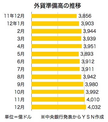 中央銀行が4日発表した昨年12月末時点の外貨準備高は4,031億6,900万米ドルで、前月から22億1,300万米ドル増加、引き続き過去最高を更新した。2012年通年での外貨準備高の増加幅は176億2,200万米ドルに達した。5日付蘋果日報などが報じた。