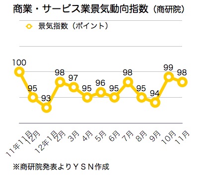 商業発展研究院(商研院、CDRI)が7日発表した11月の商業・サービス業の景気動向指数「商業服務業景気指標(ISI)」は前月比1ポイント下落の98ポイントで、景気信号は12カ月連続で「黄青(後退傾向)」だった。商研院は12月はクリスマスや年末年始の連休で小売業や飲食業の売上高が増え、景気信号は「緑(安定)」に転じる可能性が高いと指摘した。8日付工商時報が報じた。