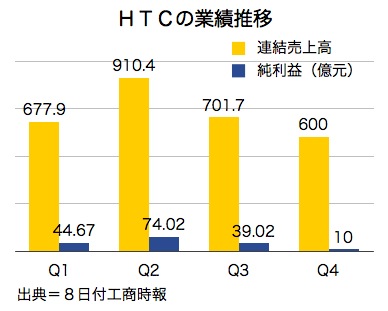 宏達国際電子(HTC)が7日発表した第4四半期の連結売上高は前期比14.47%減の600億1,300万台湾元(約1,800億円)だった。純利益は10億元で前期比74.37%、前年同期比90.92%の大幅減となった。また2012年通年の売上高は前年比37.9%減の2,890億2,000万元で、純利益は167億7,000万元となった。8日付工商時報などが報じた。