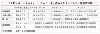 台湾大哥大の販売価格は、月額650台湾元の使い放題プラン2年契約とセットの16GB(ギガバイト)モデルでiPad miniが8,990台湾元(約2万7,000円)、第4世代iPadは同様のプランで1万3,990元など。