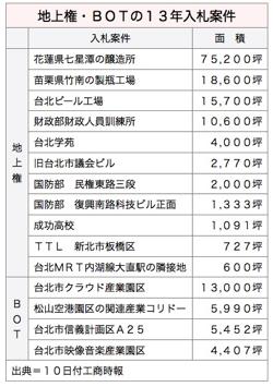 米系不動産コンサルティング会社、ジョーンズ・ラング・ラサール(JLL、仲量聯行)の趙正義総経理は「今年は生保会社に対する不動産購入制限政策で余裕資金が行き場を失っているほか、政府が財源確保に向け、地上権入札や建設・運営・譲渡(BOT)方式による事業権入札を行うとみられ、地上権が土地取引の主流になる」と分析した。