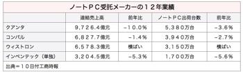 ノートパソコン受託生産大手、広達電脳(クアンタ・コンピュータ)および仁宝電脳工業(コンパル・エレクトロニクス)は、昨年のノートPC出荷台数および連結売上高がともに前年比で減少した。クアンタは、「ノートPC産業の大幅成長時代はすでに過去のもの」との認識を示した。10日付工商時報などが報じた。