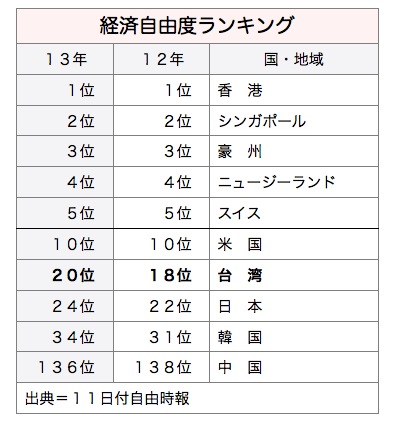 米ヘリテージ財団とウォールストリート・ジャーナルが10日発表した2013年「経済自由度指数」で、台湾は調査対象の世界177カ国・地域で20位と、前年18位から2ランク順位を下げた。24位の日本(前年22位)と34位の韓国(前年31位)を上回り、アジア太平洋地域5位だった。11日付経済日報などが報じた。