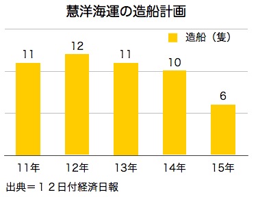 ばら積み貨物の台湾最大手、慧洋海運(ウィズダム・マリン)は11日、8万2,000トンのパナマックス級ばら積み船を大島造船所(本社・長崎県西海市、南浩史社長)と常石造船(広島県福山市、川本隆夫社長)から合計3隻、1億4,000万米ドルで購入すると発表した。引き渡しは2013~15年の予定。同社は過去2年、保有船舶数を年間10隻以上増やしており、14年には合計で100隻を上回るとみられる。12日付経済日報が報じた。