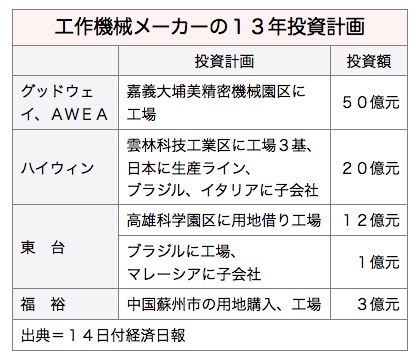 台湾の工作機械メーカーは今年、相次いで海外への工場建設を計画している。業界全体で86億台湾元(約270億円)の投資が見込まれている。14日付経済日報が伝えた。