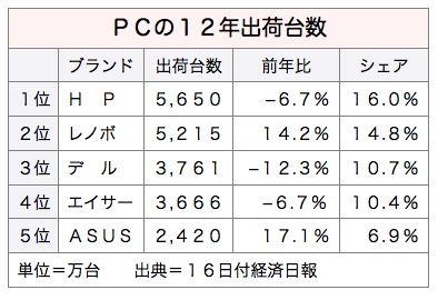 12年PC出荷台数は上位から、▽ヒューレット・パッカード(HP)、5,650万台(前年比6.7%減)▽聯想集団(レノボ)、5,215万台(同14.2%増)▽デル、3,761万台(同12.3%減)▽宏碁(エイサー)、3,666万台(同6.7%減)▽ASUS、2,420万台──。