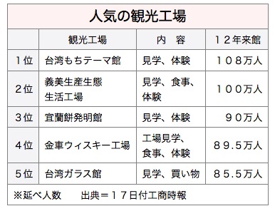 昨年、最も観光客が多かった観光工場は、台湾麻ショ(ショは米へんに署)主題館(南投県)の延べ108万人。以下、▽義美生産生態生活工場エリア(桃園県)、延べ100万人▽宜蘭餅発明館(宜蘭県)、延べ90万人▽金車ウィスキー工場(宜蘭県)、延べ89万5,000人▽台湾ガラス館(彰化県)、85万5,000人──となった。