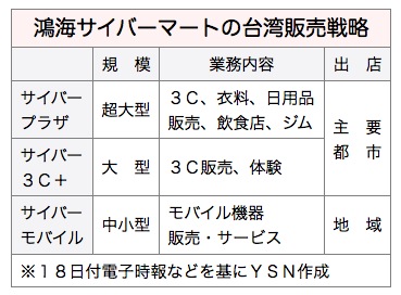 EMS(電子機器受託生産サービス)世界最大手、鴻海精密工業傘下の3C(コンピューター、通信、家電)製品販売店、賽博数碼広場(サイバーマート)は17日、3C製品だけでなく、流行ファッション、スキンケア用品などを取り扱い、レストランやスポーツジムまで備える「サイバープラザ」を7月に台南市でオープンすると発表した。サイバーマートの販売充実は、郭台銘董事長が昨年宣言した(製造から)商業方面への多角化戦略に基づく。18日付中国時報などが報じた。
