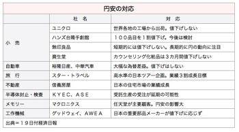 一方、半導体パッケージング・テスティング(封止・検査)の京元電子(KYEC)、日月光半導体製造(ASE)は、日本大手メーカーからのイメージセンサーの受注が延期となる可能性がある。半導体メモリー大手、旺宏電子(マクロニクス・インターナショナル)は任天堂が顧客で、日本円建ての出荷割合が高いため、為替差損が懸念される。