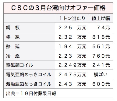 中国鋼鉄(CSC)が18日発表した3月の台湾域内市場向けオファー価格は、鉄鉱石の国際価格の大幅上昇を受け、平均3.08%の引き上げ幅となった。1トン当たり612台湾元(約1,900円)の値上げだ。19日付工商時報などが報じた。