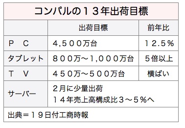 ノートパソコン受託生産大手、仁宝電脳工業(コンパル・エレクトロニクス)の陳瑞聡総経理は18日、2013年のタブレット型PC出荷目標は、前年比5倍以上の800万~1,000万台と表明した。昨年10月の600万〜800万台からの上方修正だ。19日付工商時報が報じた。