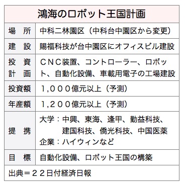 しかし、鴻海が進める計画案は、台中園区に獲得した用地(0.8ヘクタール)では、すべてを展開することが不可能で、工事の遅れを招いていた。このため、精密機械園区として開発中の二林園区への変更を検討しているとみられ、郭総裁も何度か同園区の視察に訪れたもようだ。中科管理局によると、鴻海が二林園区に進出する場合、60~100ヘクタールの土地を確保できる。これを受け鴻海の邢治平広報担当は21日、智動化創新園区計画は、建設場所や土地取得など詳細を検討中で最も理想的な場所を模索していると説明した。