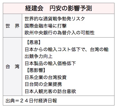 一方、行政院経済建設委員会(経建会)は、円安進行によって、日本企業の台湾への工場投資、日台間の産業協力、日本人観光客の来台に影響が懸念されるとの認識を示した。