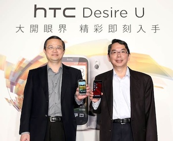 中華電信行動通信分公司の林総経理(右)は24日、宏達国際電子(HTC)の新機種スマートフォン「Desire U」を独占販売することを発表した。中華電信はHTCの調達比率を昨年の2割から拡大する見通しだ(HTCリリースより)