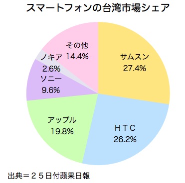 調査によると、台湾の携帯電話ユーザーの47.2%がスマートフォンを使用していた。使用スマートフォンは、▽サムスン、27.4%▽HTC、26.2%▽アップル、19.8%▽ソニー、9.6%▽ノキア、2.6%▽モトローラ、2.4%──の順だった。