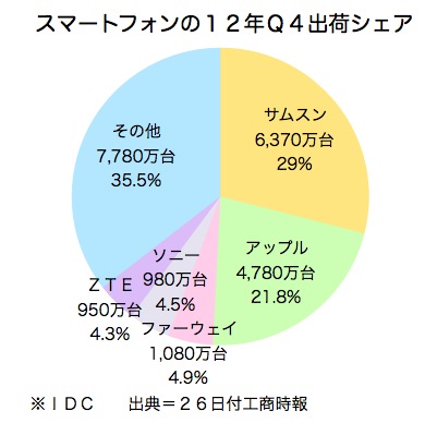 上位2位は▽サムスン電子、6,370万台(シェア29.0%、同76.0%増)▽アップル、4,780万台(シェア21.8%、同29.2%増)──で、4位はソニーの980万台(シェア4.5%、同55.6%増)だった。市場全体は同36.4%増の2億1,940万台だった。