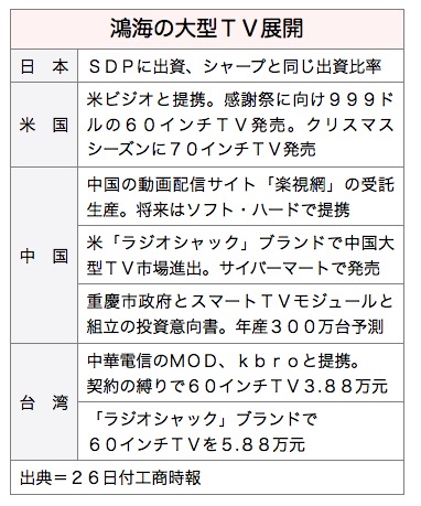 鴻海とビジオは昨年、60インチの液晶テレビを999米ドルの低価格で北米市場に投入すると、わずか3カ月でシェア6割を獲得。サムスン電子を抜いて大型テレビ市場で首位に躍り出た。その後クリスマス商戦を狙って70インチ液晶テレビを投入すると、ビジオブランドの知名度はさらに上昇した。