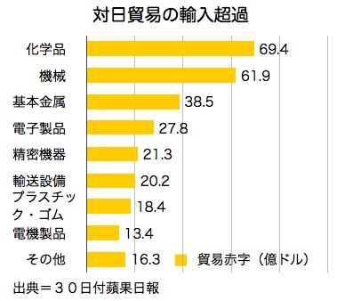 台湾最大の輸入先である日本からの2012年輸入額は約476億米ドルに上った一方、日本への輸出額は約189億米ドル(上位4番目)で輸入超過となっている。特に輸入超過額が大きいのは化学品(69億4,000万米ドル)と機械(61億9,000万米ドル)だが、日本円が対米ドルで円安が進行すれば、超過額が縮小に向かうとの見方を示した。
