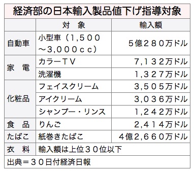 経済部関係者によると、日本からの輸入額上位30品目を中心に第1弾の対象商品を選出中で、今後徐々に拡大したい考えだ。ただ値下げ指導に法的な強制力はなく、政府は「道義的」に値下げを要請することしかできない。