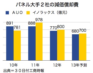 AUOの減価償却費は2011年が890億元、12年が770億~780億元。イノラックスは昨年800億元と、いずれも過去2年間がピークとなり、利益を圧迫していた。しかし第6世代工場の減価償却が終わりに近づき、7.5および8.5世代工場の減価償却費も今年から減少に向かい、今後は同費用が年10~20%の割合で軽減される見通しだ。
