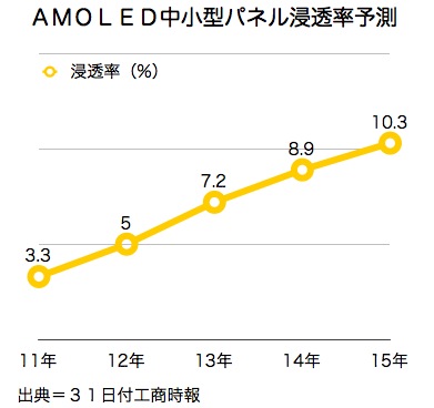 また市場調査会社、テクノ・システム・リサーチ(TSR)によると、世界の中小型AMOLEDパネルの出荷枚数は、11年が約8,500万枚、12年には1億4,200万枚まで拡大。今後は▽13年、2億700万枚▽14年、2億7,300万枚▽15年、3億2,800万枚▽16年、3億6,300万枚──と予測している。
