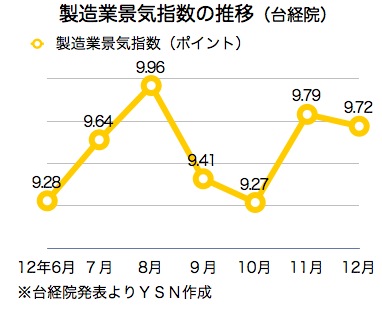 台経院は、米ドル建ての昨年12月輸出受注額は前年同月比8.5%増加、輸出総額は同9%増加、製造業生産指数は同2.84%上昇したが、対米ドル3.96%の台湾元高で、台湾元建ての製造業の生産額、販売額、輸入額がいずれも減少したと指摘した。