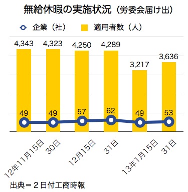 行政院労工委員会(労委会)が1日発表した統計によると、「無給休暇」の実施を届け出ている企業は1月31日時点で前回(1月15日)より4社増加して53社、適用者数は419人増の3,797人(通報ベース、実施ベースでは3,636人)となった。今年の景気は多くの経済指標で好転が示されているものの、対象人数の増加は景気回復に疑問を抱かせる結果となった。2日付工商時報が報じた。