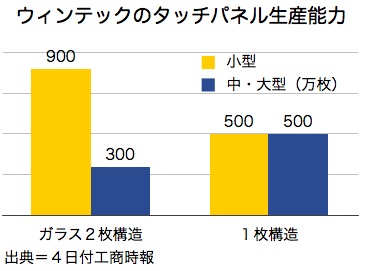 ウィンテックによると、蘇州工場および東莞工場におけるG/Gタッチパネル貼り合わせラインの生産能力は中小型製品で月産900万枚(うち中型300万枚)。今後はまずスマートフォンやタブレット型パソコン向けなど中小型の薄膜製品を手掛ける方針で、受注状況を見て生産ラインの移行を進める。
