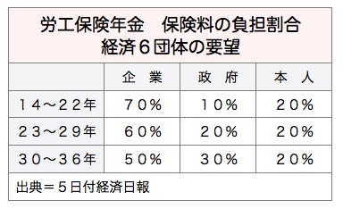 経済6団体は、被雇用者の負担割合を20%で維持したまま、14〜22年は事業主70%・政府10%で変更せず、▽23〜29年、事業主60%・政府20%▽30〜36年、事業主50%・政府30%──と3段階で調整するよう求めた。