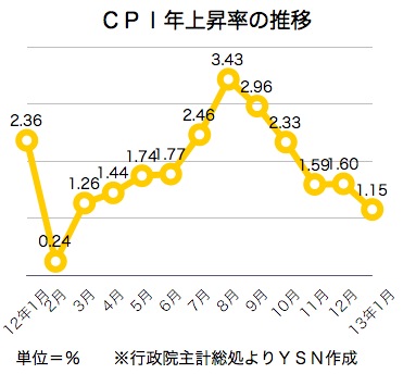 行政院主計総処が5日発表した1月の消費者物価指数(CPI)は102.44ポイントで、前月比0.15%下落、前年同月比1.15%上昇した。前年比上昇率は過去11カ月で最低となった。ただ、昨年は1月に春節(旧正月)を迎え、タクシー運賃や旅行ツアー代金が値上がりしたことから、今年の年上昇率が抑えられた要素がある。一方、2月は春節で物価上昇が見込まれるため、今年1〜2月の状況は2カ月平均で観察するのが妥当と主計総処は指摘している。6日付工商時報が報じた。