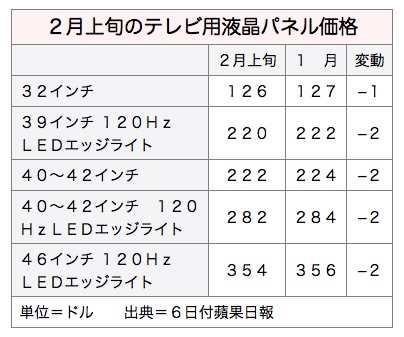 市場調査会社、ディスプレイサーチによると、2月上旬、モニター、ノートパソコン、テレビ用液晶パネルの価格が前月比で1~2米ドル程度値下がりした。非需要期で、在庫圧力が高まっていることが原因とみられる。6日付蘋果日報が報じた。